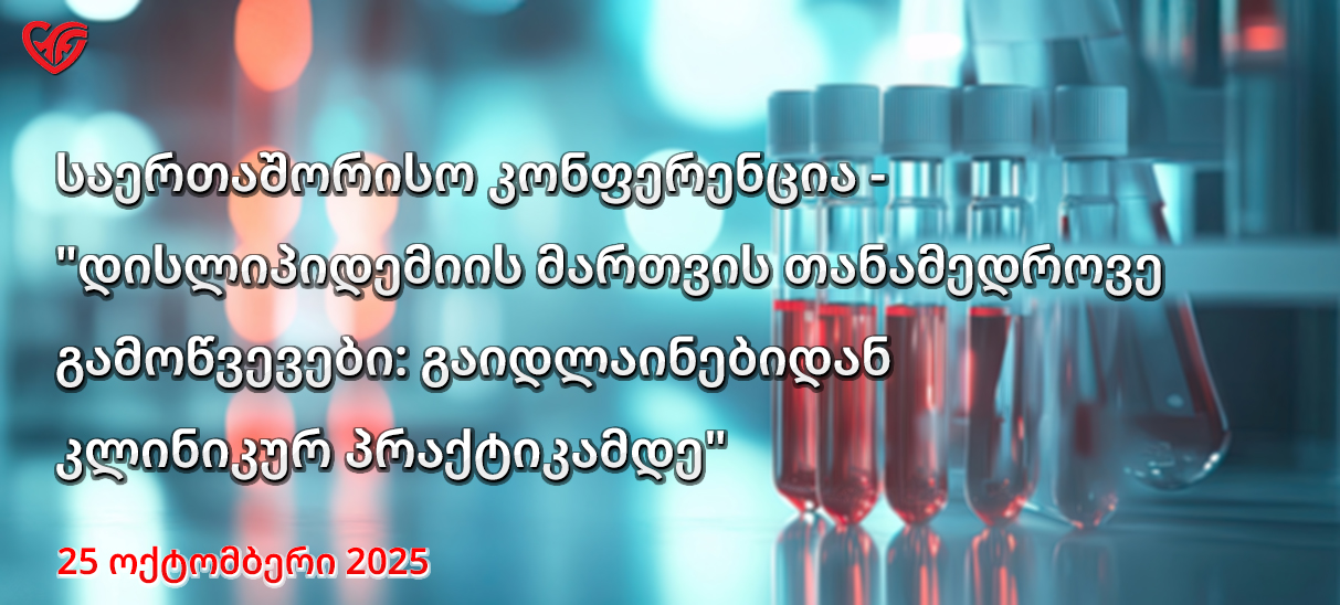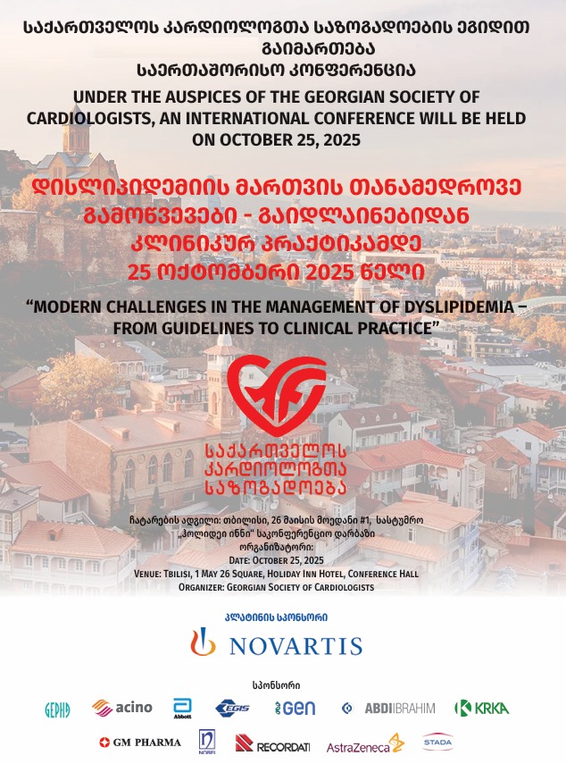 საქართველოს კარდიოლოგთა საზოგადოების ინიციატივით მიმდინარე წლის 25 ოქტომბერს ქ. თბილისში “ჰოლიდეი ინნ”-ის საკონფერენციო დარბაზში გაიმართება საერთაშორისო კონფერენცია – “დისლიპიდემიის მართვის თანამედროვე გამოწვევები: გაიდლაინებიდან კლინიკურ პრაქტიკამდე” და იგი სრულად დაეთმობა ევროპის კარდიოლოგიის საზოგადოების (ESC) დისლიპიდემიის გაიდლაინის უახლეს განახლებებსა და კლინიკურ რეკომენდაციებს.