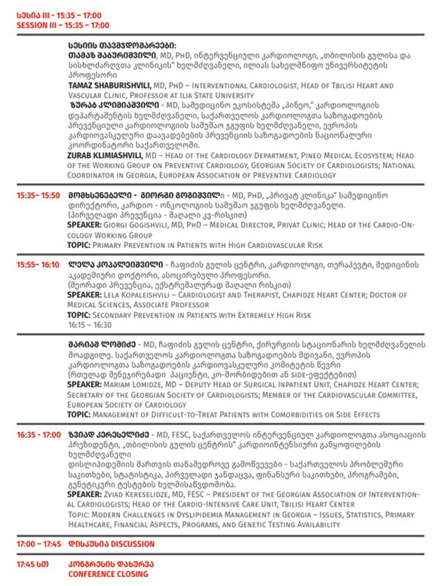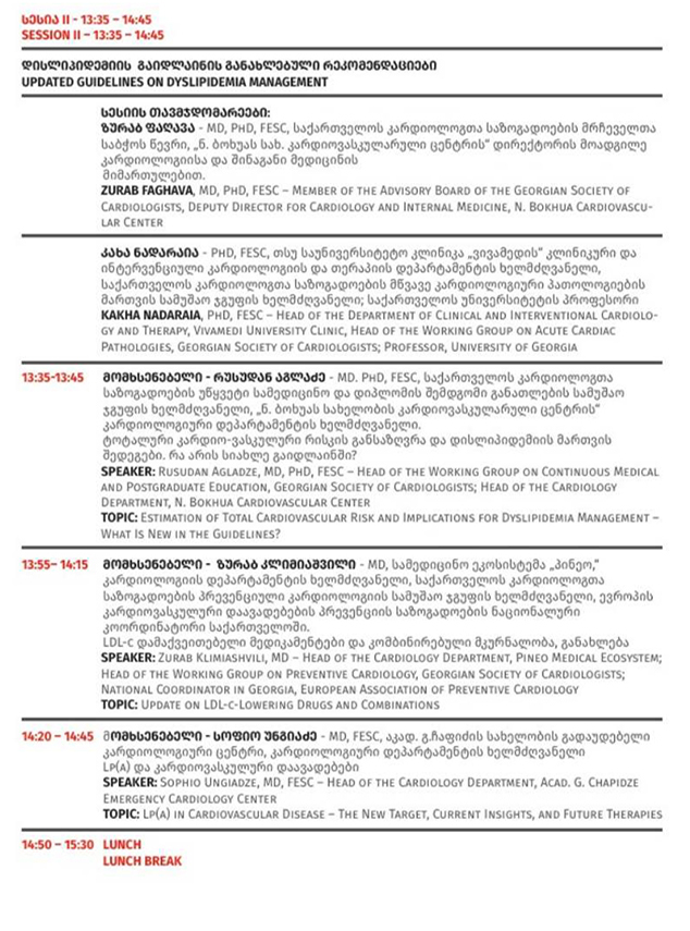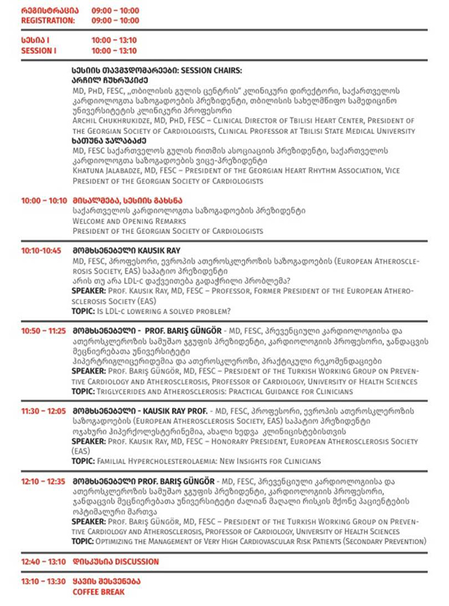 ქართველ წამყვან კარდიოლოგებთან ერთად მომხსენებლები იქნებიან ევროპის ათეროსკლეროზის საზოგადოების (European Atherosclerosis Society, EAS) საპატიო პრეზიდენტი კაუსიკ რეი. ინგლისელი პროფესორი წამყვანი მკვლევარია გლობალურ კლინიკურ კვლევებში, ახალი თერაპიების შემუშავების და კორონარული დაავადებების პრევენციის სფეროში, განსაკუთრებით ქოლესტერინის, ლიპიდების და მეტაბოლური დაავადებების მიმართულებით.